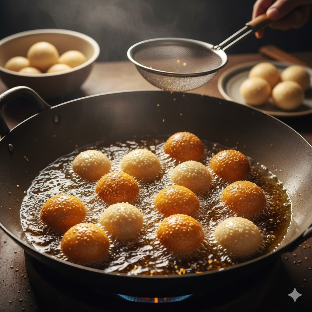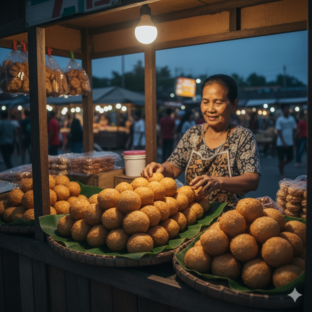 Kue bulat berbalut biji wijen ini memiliki tekstur renyah di luar dan lembut di dalam, dengan isian kacang hijau manis yang khas.